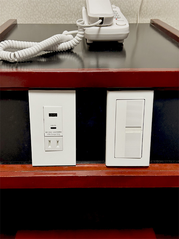 また、ベッドサイドに新たにUSB付き電源タップを各部屋取り付けを行っておりますので是非ご利用下さい。